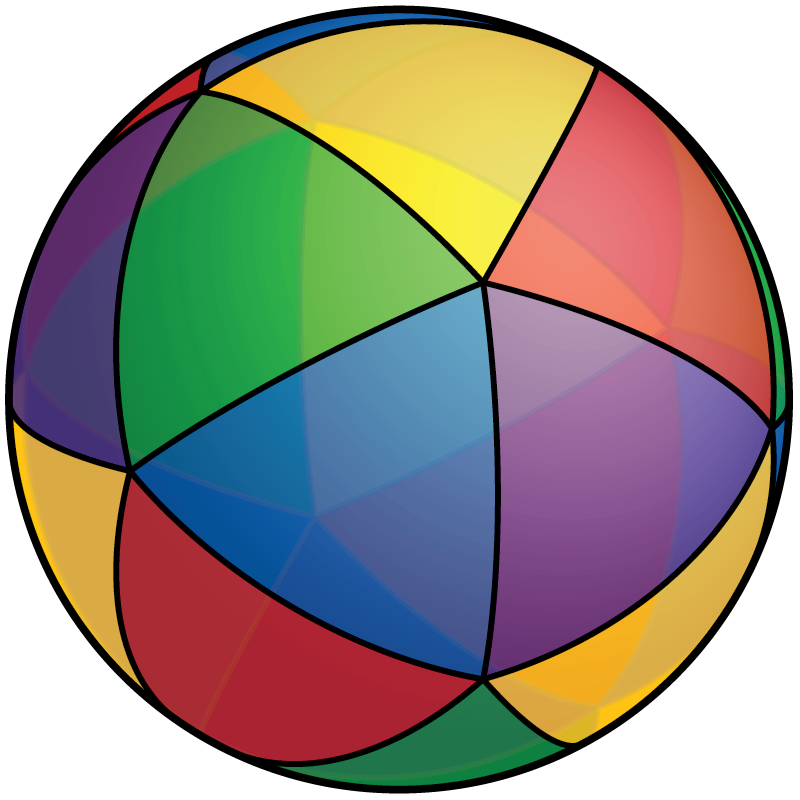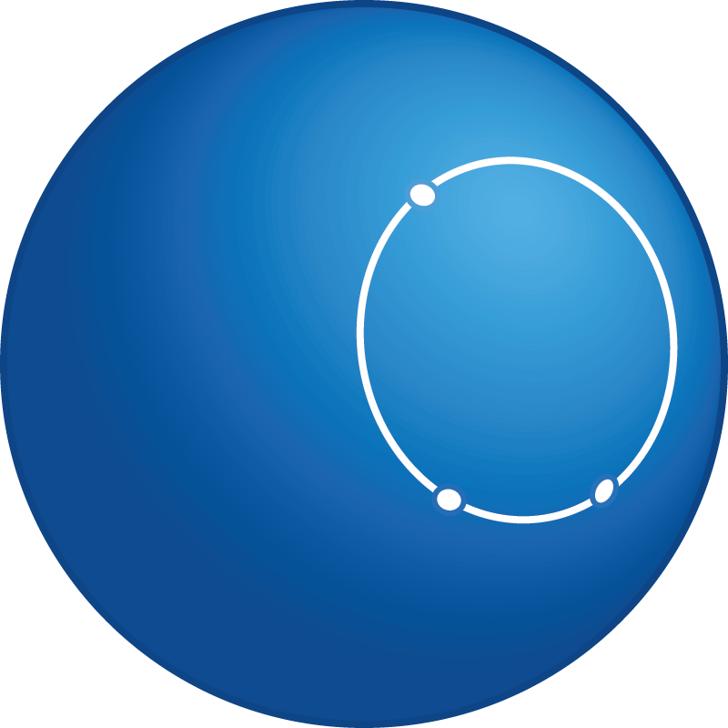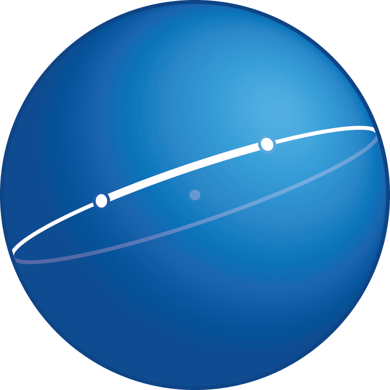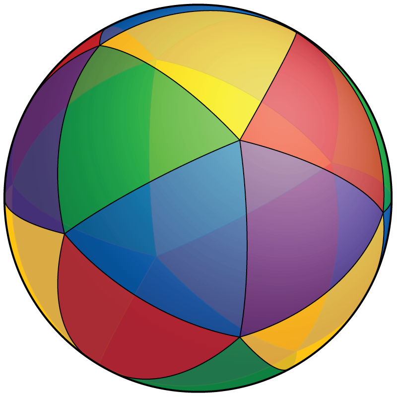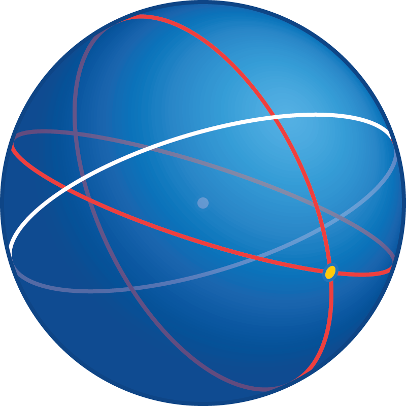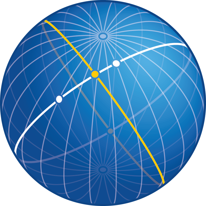 Точки — точки на единичной сфере, прямые — большие круги (сечения сферы плоскостями, проходящими через центр).
