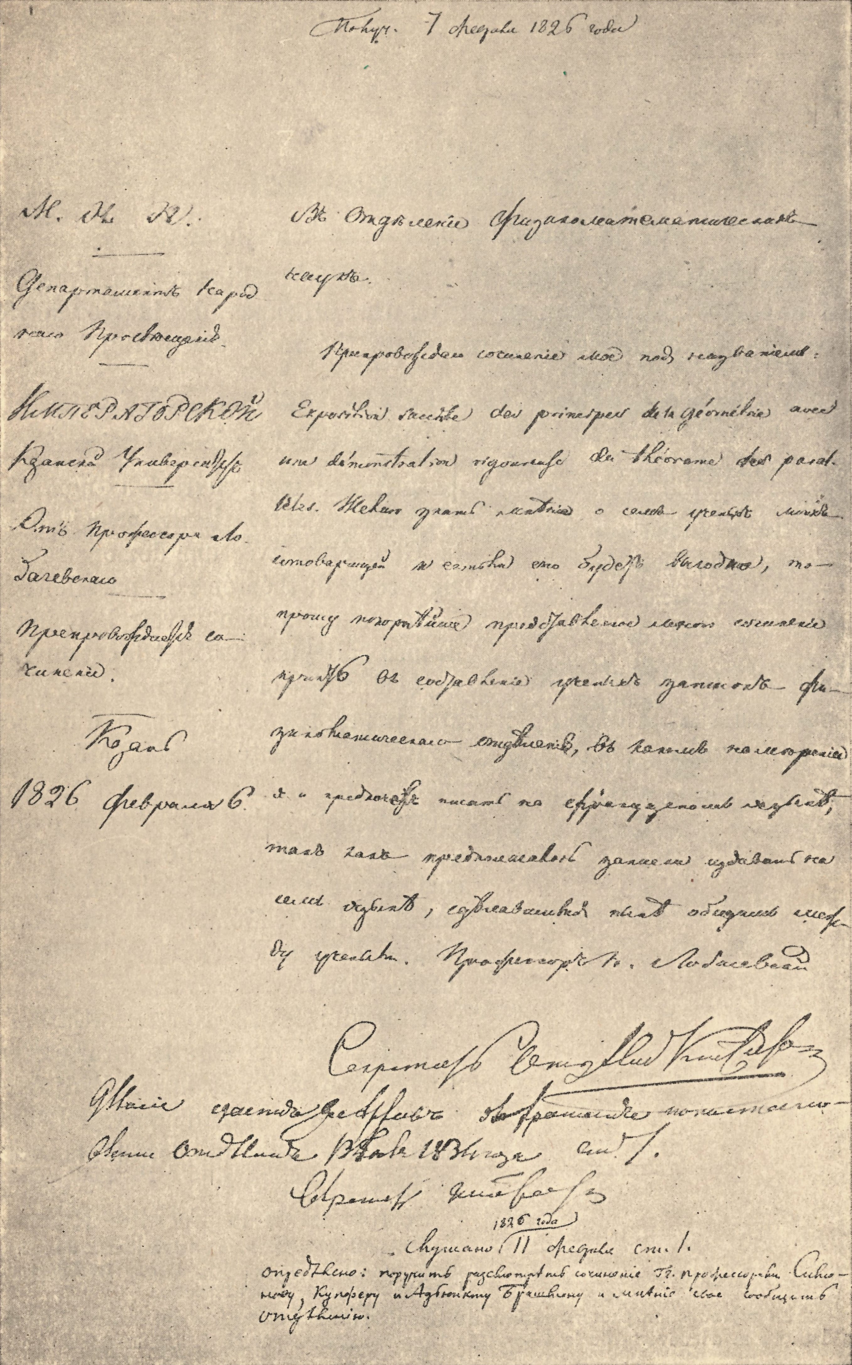Препровождаю сочинение моё под названием: Exposition succincte des principes de la Géométrie avec une démonstration rigoureuse du théorème des parallèles […] Профессор Н. Лобачевский. 6 февраля 1826. [С фр. — Сжатое изложение начал геометрии со строгим доказательством теоремы о параллельных.]