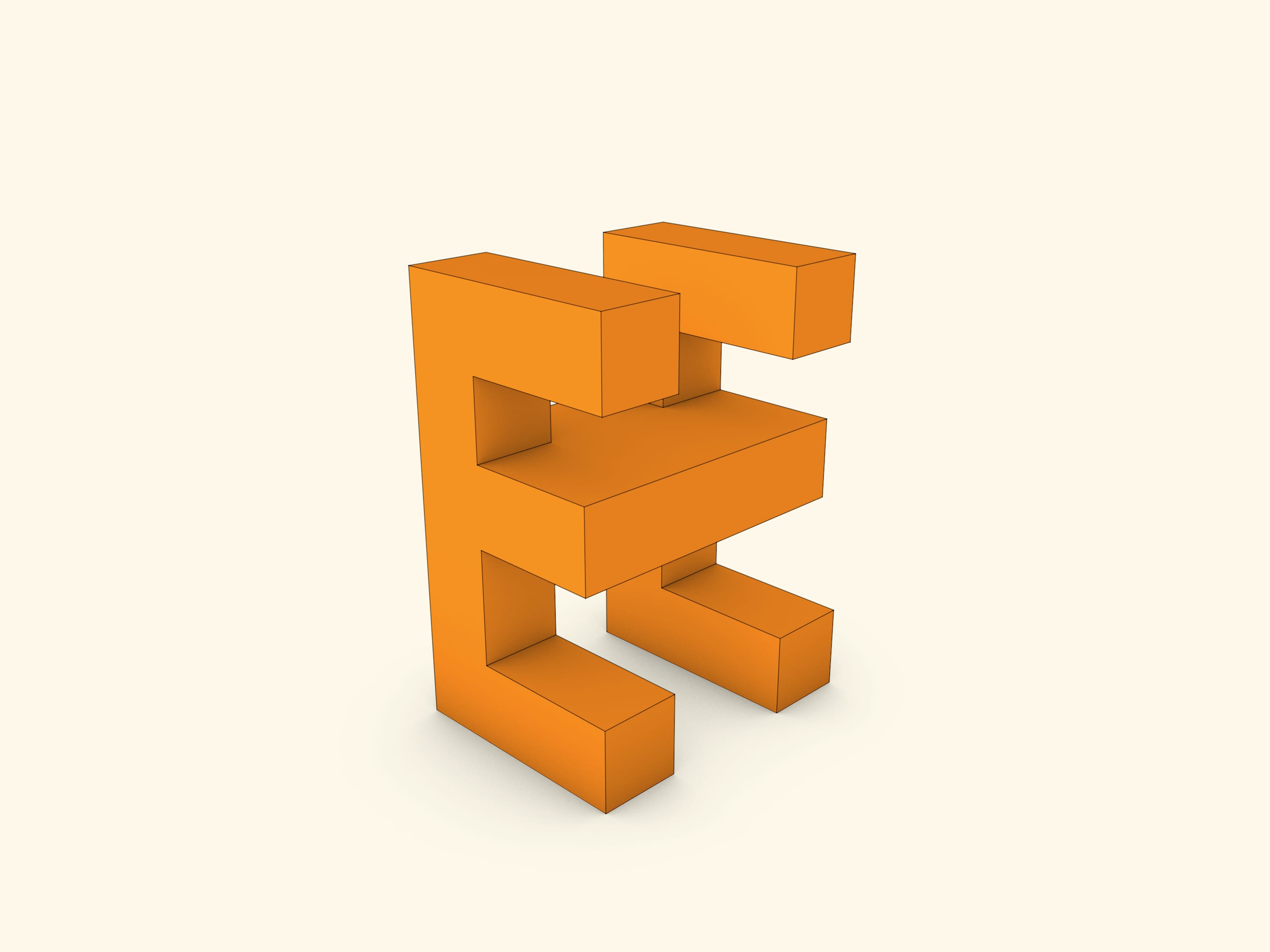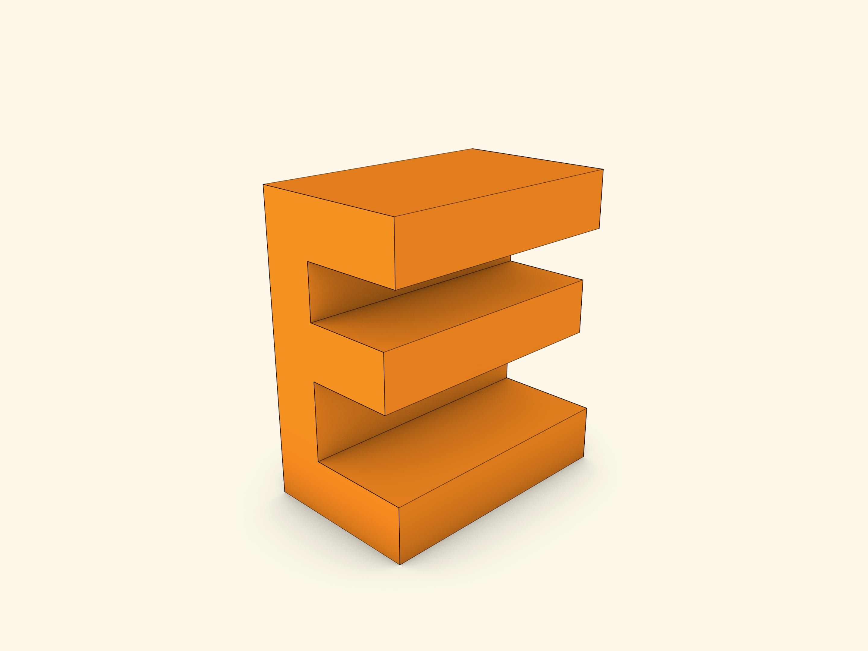 Рассмотрим простой пример: смоделируем тело, которое с одного направления читается как буква „Е“, а с перпендикулярного — как буква „Н“. Воспользуемся стандартной 3D-операцией «extrude» (выдавливание, вытягивание): создадим цилиндр (они бывают не только прямые круговые!) с основанием в виде буквы „Е“ и цилиндр в виде буквы „Н“ в перпендикулярном направлении.