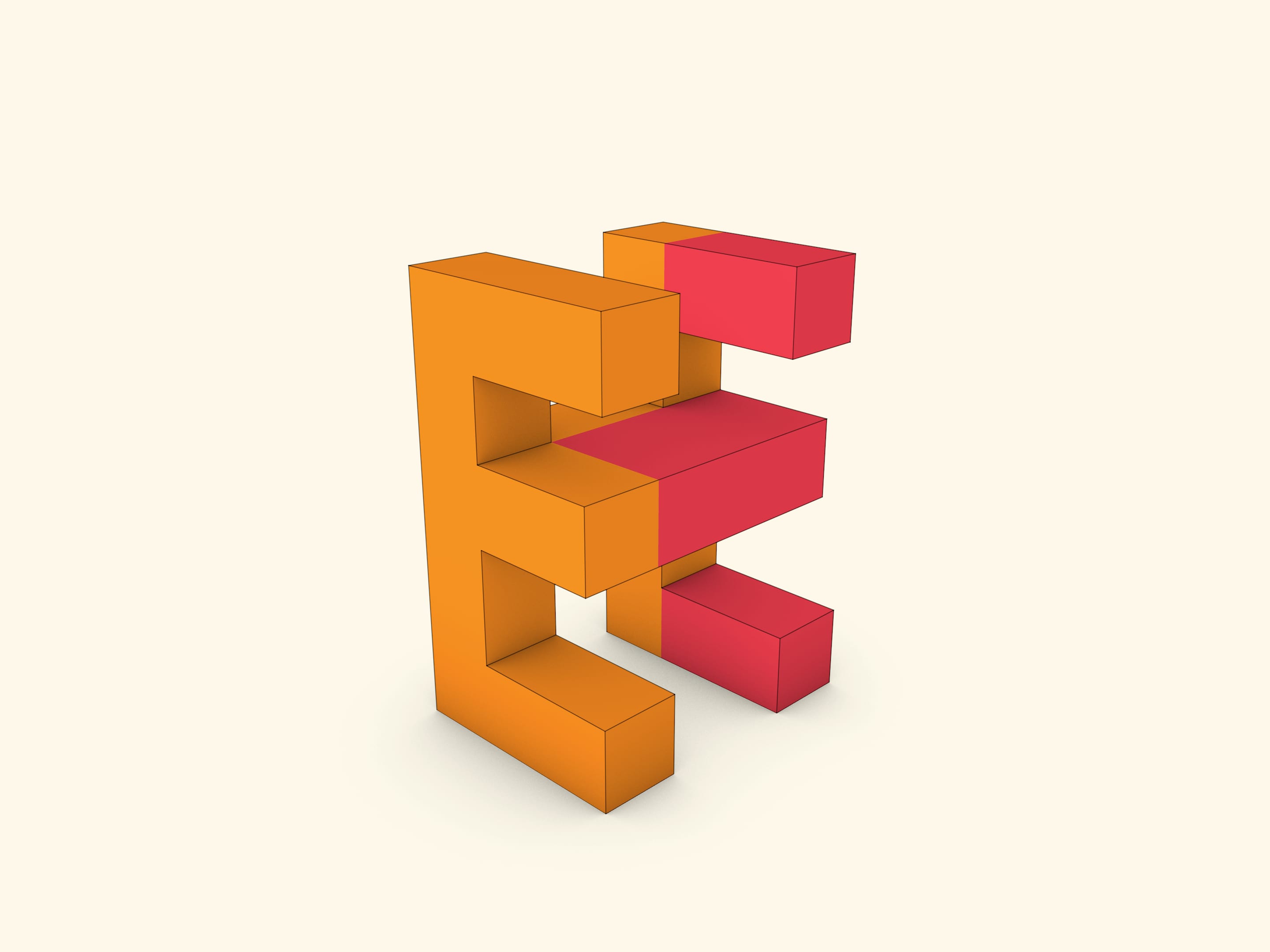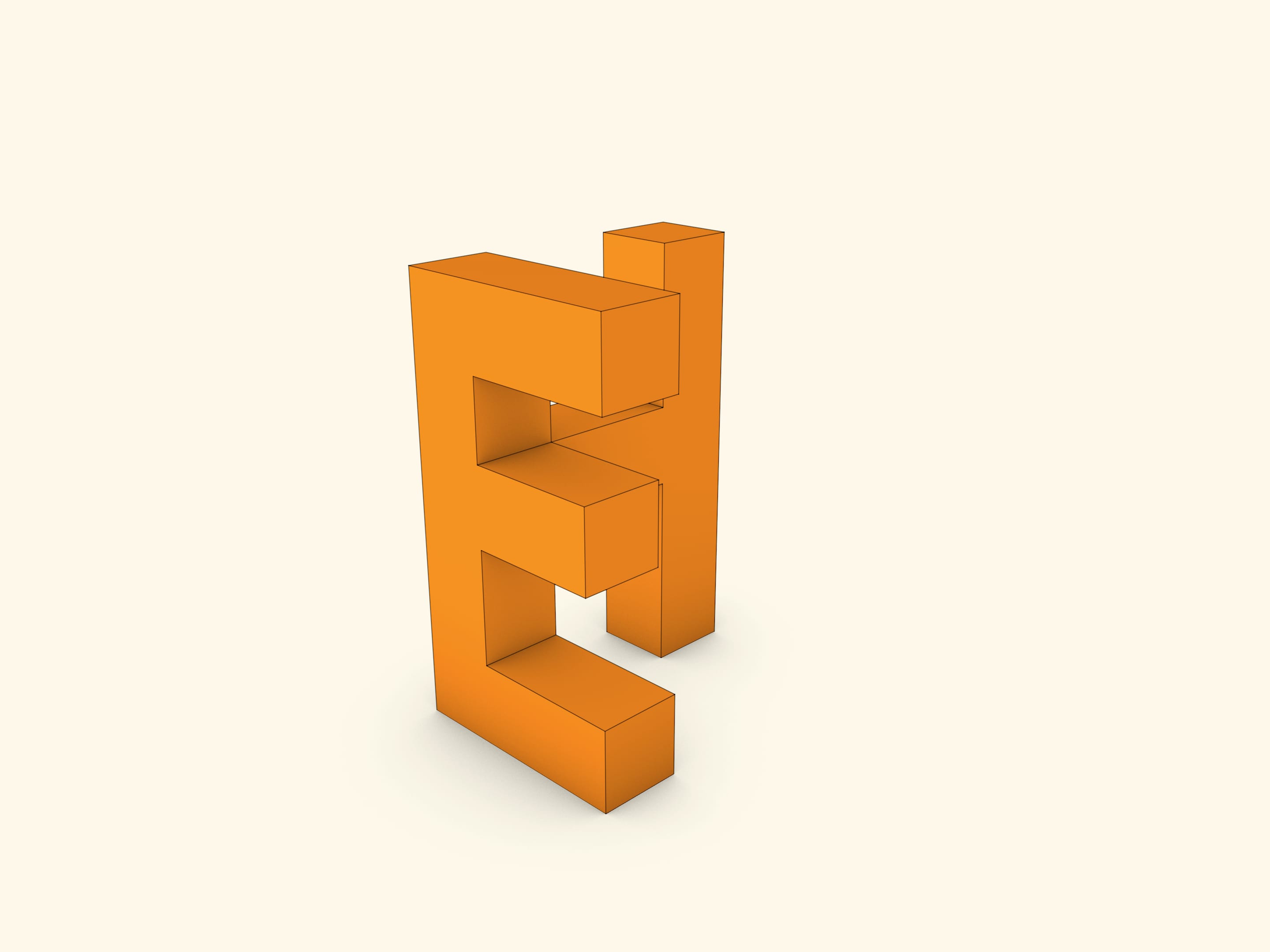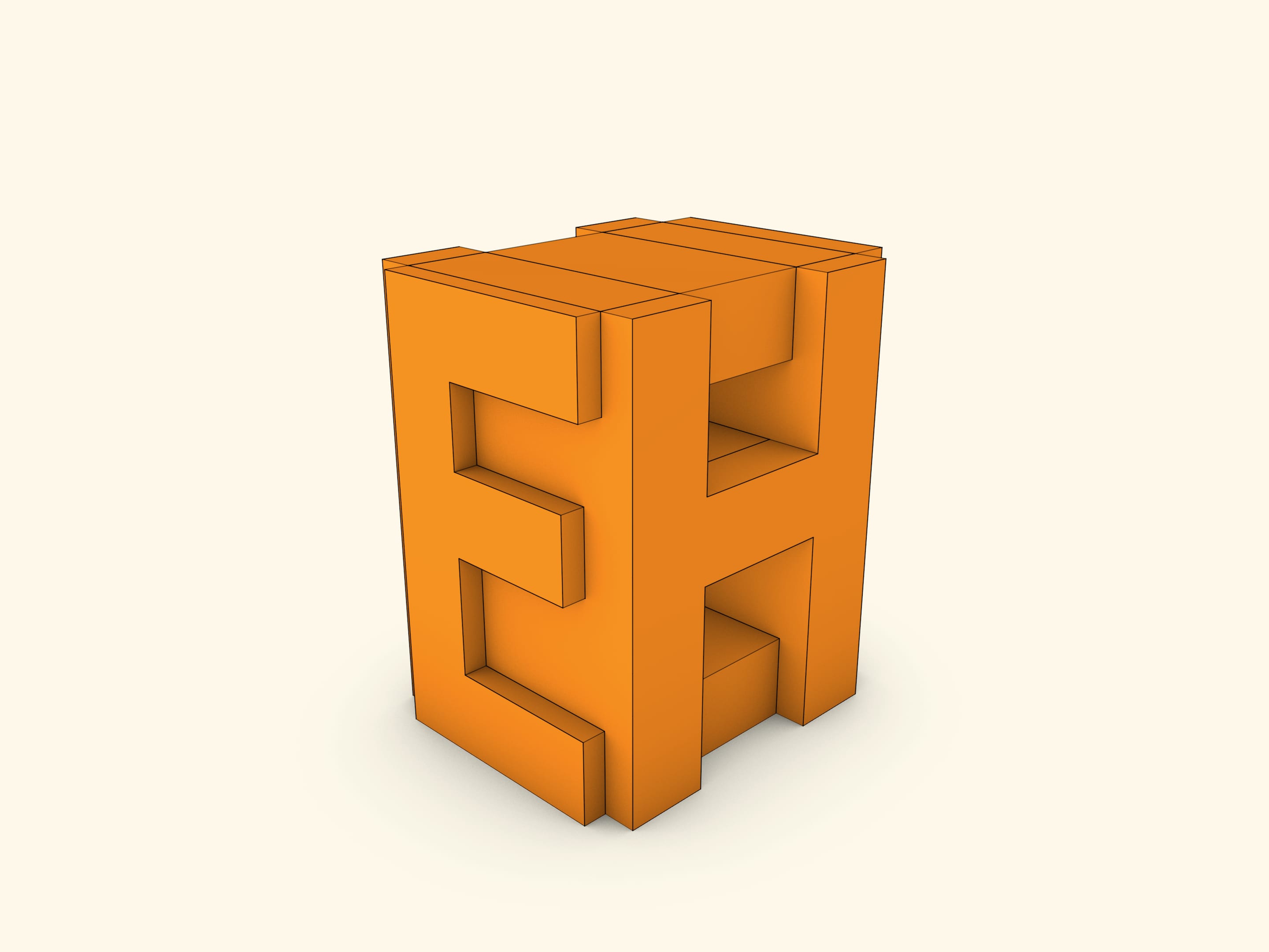 Оставим только их пересечение: применим булеву операцию «intersect», после которой остаётся объём, который есть в обоих объектах. На этом можно было бы и остановиться — это тело с одного направления выглядит как буква „Е“, а с другого — как буква „Н“. Но при 3D-печати стараются экономить и время печати, и материал, и полученную конструкцию можно оптимизировать: удалить объёмы, которые дублируются в каком-то из видов и при их удалении не портится второй вид. Получившаяся конструкция будет выглядеть и лаконичнее, и изящнее.
