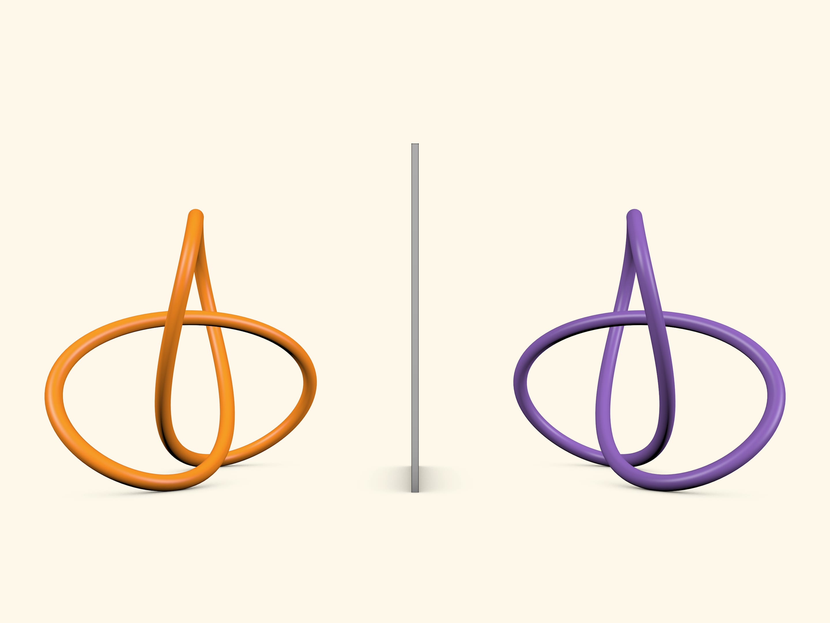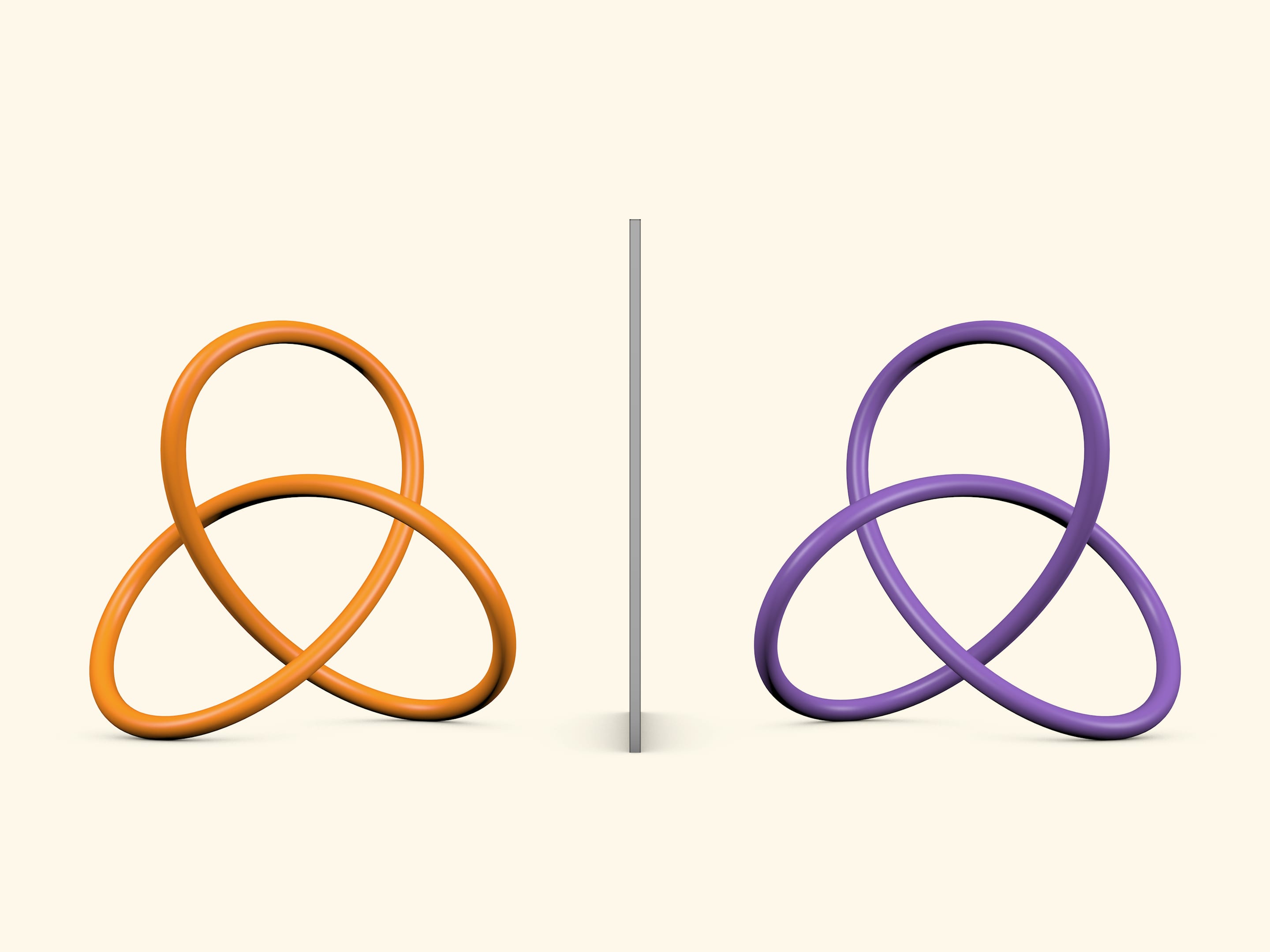 Если зеркально отразить правый трилистник, то получится левый трилистник. Они очень похожи друг на друга, кажется, что если один повернуть относительно другого, то они совпадут, но никаким (собственным) движением их совместить нельзя. Это свойство называется хиральностью. Хиральность имеет очень важное значение в химии и биологии и чаще всего объясняется на ладошках: вы можете приложить одну ладонь к другой, но совместить их не получится. А в школе мы сталкиваемся с хиральностью, когда изучаем правило буравчика, правило правой руки, учимся рисовать декартову систему координат в трёхмерном пространстве общепринятым образом.